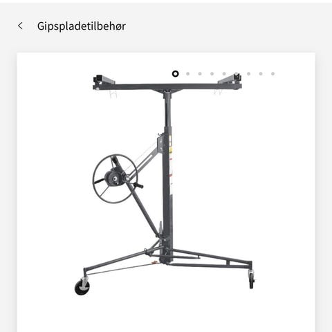 Gipspladeløfter til montering af gipsplader i loft. Udstyret med tre ben og hjul for nem flytning og stabilitet under arbejdet. Løftearmen kan vippes og justeres i højde, så plader kan monteres både vandret og skråt/kip. Velegnet til håndtering af større gipsplader ved indendørs bygge- og renoveringsopgaver.