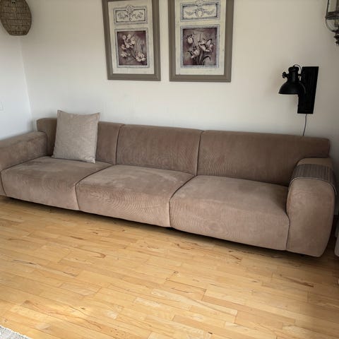 Sofa i karrygul fløjl med brede ribdetaljer. Sofaen har lige armlæn og løse sæde- og ryghynder i samme stof. Benene er slanke og mørke, hvilket giver et let udtryk. sofaen kan bruges som ekstra soveplads.