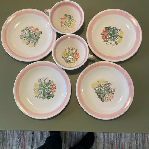 Tekande,5tekopper 5underkopper,6 sidetallerkener,cabaretfad og 2 andre fade