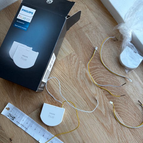 Philips Hue wall switch module i hvid. Sættet indeholder to indbygningsmoduler til montering bag eksisterende vægkontakter, så de kan integreres i et Philips Hue-lyssystem. Modulerne gør det muligt at styre Hue-lyskilder via den almindelige vægkontakt uden at afbryde strømmen til pærerne. Leveres med tilhørende ledningsforbindelser og klemmer som vist på billederne.