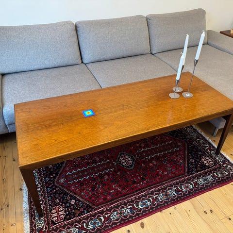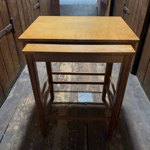 3 små borde i hårdt træ, nok teak. Flot snedkerarbejde. De to inderste af bordene er i rigtig flot stand. Det yderste er desværre i stykker i nogle af samlingerne, så det skal evt repareres, ligesom det kræver mere pleje.