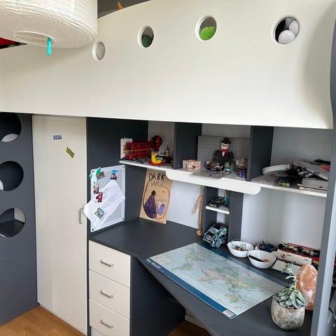 Sengen er en fantastisk pladsbesparende løsning, da den kombinerer en god soveplads med et fuldt funktionelt skrivebord og indbygget reol under sengen.