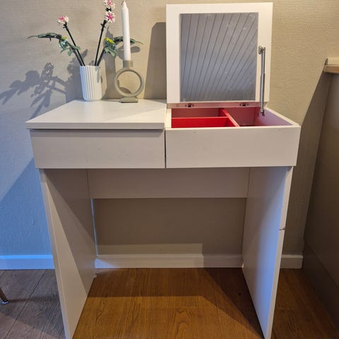 Brugt sminkebord. Min datter har været temmelig rundhåndet med neglelakken, og det ses tydeligt på bordpladen. Kan måske fjernes. Vandskader (tror jeg) Se billeder.