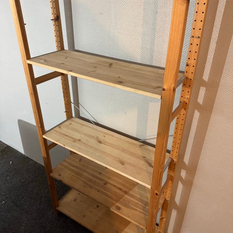 IKEA reol i træ med åbne hylder. Reolen er velegnet til opbevaring af bøger, dekoration eller andre genstande i stue, kontor eller værelse. Designet er enkelt med flere faste hylder og en træfinish, der giver et roligt og neutralt udtryk. Design af Alfred Homann.