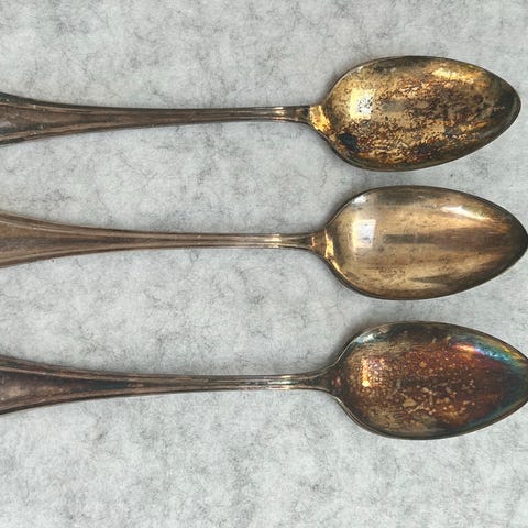 sæt med serveringsske og kagespade - måske sølv. Serveringsskeen har rund, dyb ske, mens kagespaden har trekantet blad egnet til udskæring og servering af kage eller tærte.