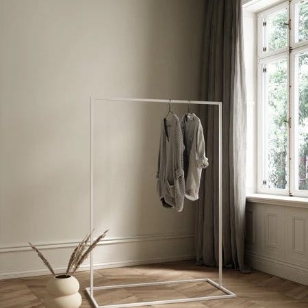 Flot hvidt tøjstativ til at hænge bøjler på. Lavet af pulverlakeret stål.
