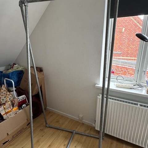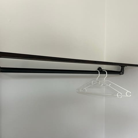 Væghængt tøjstativ af sølvfarvede vandrør med hylde i smukt lyst fyrretræ.