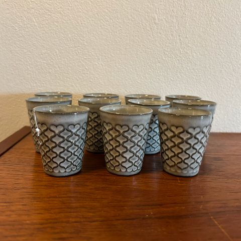 Keramik køkken- og serveringssæt i grå glasur med reliefmønster. Sættet består af flere dele, herunder rektangulær beholder med trælåg, rund beholder med låg, kande, to små krus/bægre samt beholder med låg og hank. Indersiden er glatglaseret i lys grå, ydersiden har et ensartet mønster. Egnet til opbevaring og servering i køkken eller på bord, f.eks. til sukker, småkager, snacks eller drikke. Æggebæger med små produktionsfejl