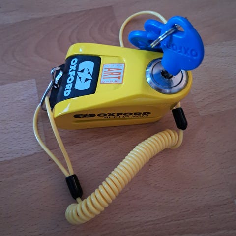 Abus skivelås til motorcykel med spiralwire i gul farve. Låsen monteres på bremseskiven og leveres med medfølgende spiralwire, der mindsker risikoen for at køre afsted med låsen på. Sættet inkluderer opbevaringstaske og nøglering til fastgørelse af nøglen. Velegnet til sikring af motorcykel eller scooter ved parkering.