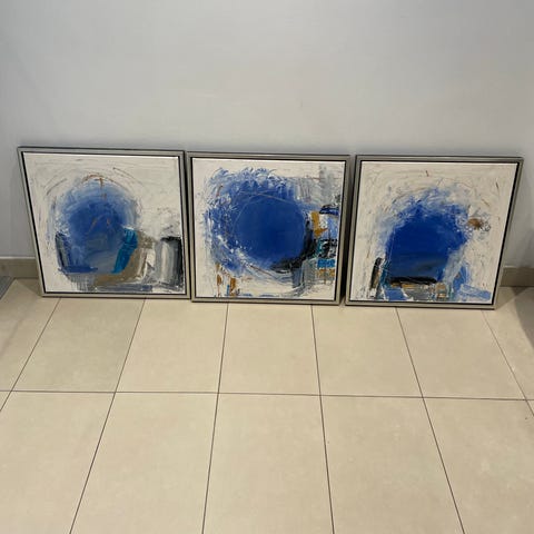 Abstrakt maleri sæt blå og hvid med sølvramme