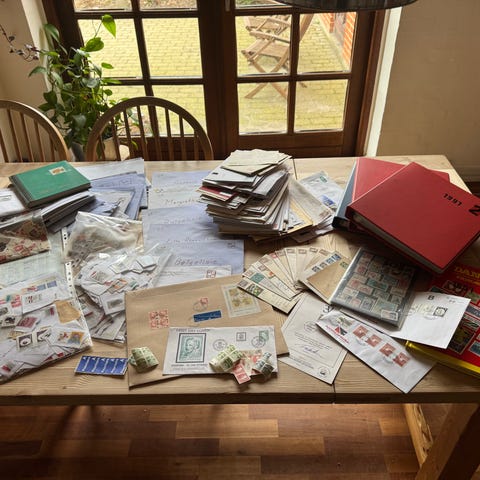 Der er albums, årsmapper, løse stemplede frimærker, kuverter og postkort med frimærker på samt meget andet.