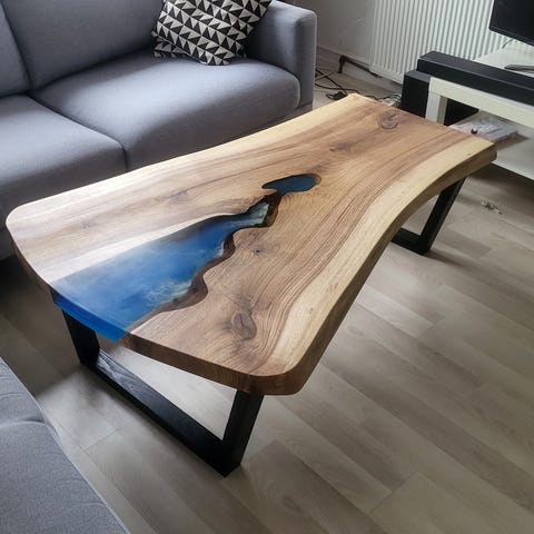 Unikt Sofabord i dansk valnød udbydes til salg. Det er lavet i eget opvarmet værksted og der findes ikke andre magen til. Det er lavet som en stor sø med vandfald ned til en lille sø der løber videre ud til en større sø i enden af bordet og med skum på vandet.