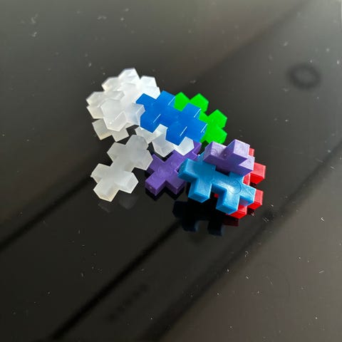 Plus Plus byggeklodser i plast i forskellige farver. Klodserne har den karakteristiske dobbelte plus-form og kan sættes sammen på mange måder til figurer og konstruktioner. Egnet som konstruktionslegetøj til børn, hvor der kan bygges både todimensionelle mønstre og tredimensionelle modeller. Leveres som løse klodser i blandede farver.