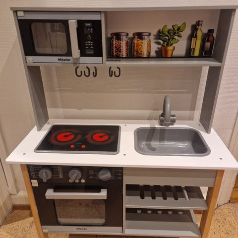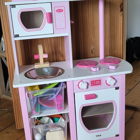 Legekøkken inkl. diverse mad og dankort maskine mv. Der er en del mere mad, end der ses på billedet. Maden er både i plast og træ.