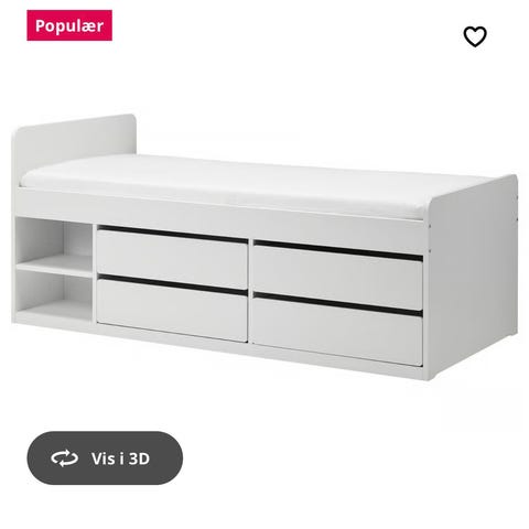IKEA seng med opbevaring i hvid. Sengen har ryglæn i den ene ende og integrerede skuffer under liggefladen til opbevaring af f.eks. sengetøj eller tøj. Egnet som enkeltseng og kan efter behov bruges som ekstra soveplads i gæsteværelse, børneværelse eller mindre soveværelse.