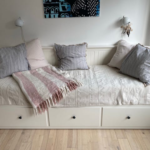 Når sengen har været trukket ud til sovende gæster, har vi lagt en foldemadras.