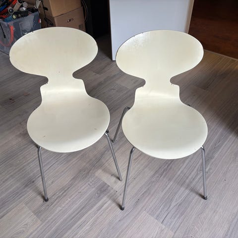 Jeg har også to hvide og to lyserøde stole til salg, og hvis du tager alle seks, kan vi nok godt finde en god pris.