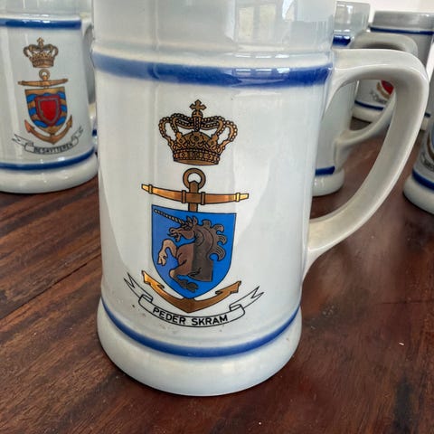 Ukendt mærke ølkrus i tin med møntmotiv