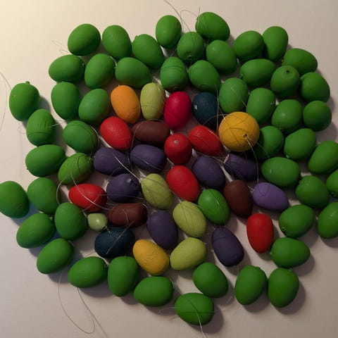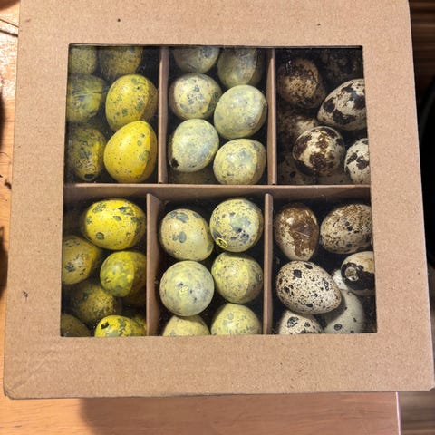 Æske med 6 malede trææg i pastelagtige farver. Med snor så de er beregnet til at hænge på en buket grene. Et æg er ca 3cm lang.