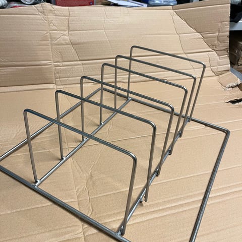 Rustfri stålopdeler til gastro-bakker. Opdelerens metalramme er udformet med flere lodrette skillerum, så flere gastro-bakker kan stå oprejst ved siden af hinanden. Kan placeres i en opvaskekurv eller på en plan overflade til opbevaring, tørring eller transport af bakker. Velegnet til professionelle køkkener, kantiner og lignende miljøer, hvor der bruges gastro-bakker i metal eller andet materiale i standardstørrelser.