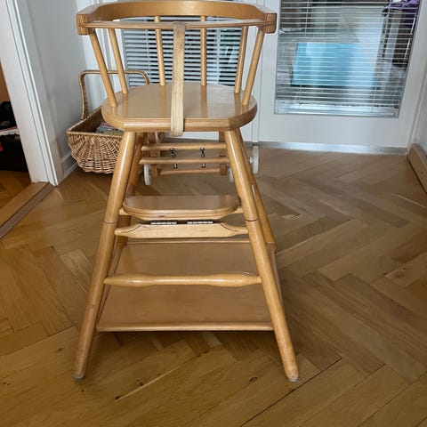 IKEA højstol i træ til børn. Klassisk højstol med ryglæn med lodrette tremmer og fodstøtte. Fremstillet i lakeret træ med naturfinish. Egnet som siddeplads ved bord for mindre børn, hvor der er behov for en højere stol end en almindelig spisebordsstol. Stabil konstruktion med fire ben og tværstivere for ekstra støtte.