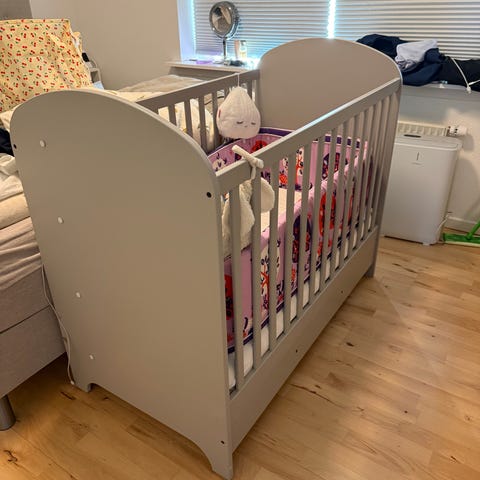 IKEA tremmeseng i hvid. Klassisk tremmeseng med faste gavle og tremmesider på den ene langside. Sengen er velegnet til småbørn og kan bruges som sovested på børneværelset. Materialet er lakeret træ/kompositmateriale med en glat overflade, der er nem at tørre af. Leveres som vist på billederne.