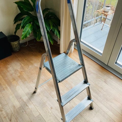 Fin aluminiums stige. 56 cm høj. Lidt malerpletter på, men fungere helt fint.