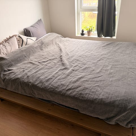 Super flot Ziggy Bed sengeramme med luksus futon madras (Comfort). Madras mål 180x200 cm, mål på ramme 206x210cm. 1 år gammel og står med minimale brugsspor. Smarte hylder og magasinholder i rammen. Nypris 12.000 kr (tilbudspris lige nu 8.800 kr).