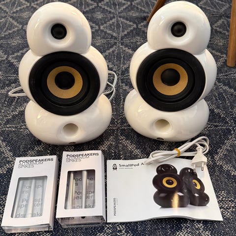 Højttalere i hvidt kabinet. Sættet består af to højttalere med indbyggede basporte på forsiden. På bagsiden af den ene højttaler er der strømtilslutning, tænd/sluk-knap, indgang til lydkilde samt terminaler til tilslutning af den anden højttaler. Den anden højttaler har tilslutningsterminaler mærket som venstre højttaler.