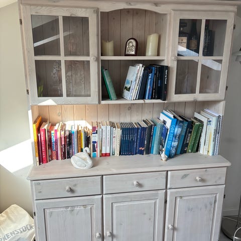 Reol med låge i lyst træ med flere faste hylder. Skabet er højt og smalt og egner sig til opbevaring af f.eks. bøger, mapper eller andre mindre genstande. Lågen har greb i træ og en midtersektion i lyst, semitransparent materiale, der giver et let udtryk og mulighed for delvis indkig til indholdet. Reolen er velegnet til brug i stue, kontor eller værelse, hvor der er behov for vertikal opbevaring på begrænset gulvplads.