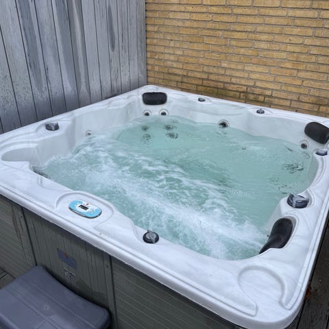 Lækker og pænt udendørs spa bad med fast kant. Plads til 6 personer. Kan varmes op til 39 grader