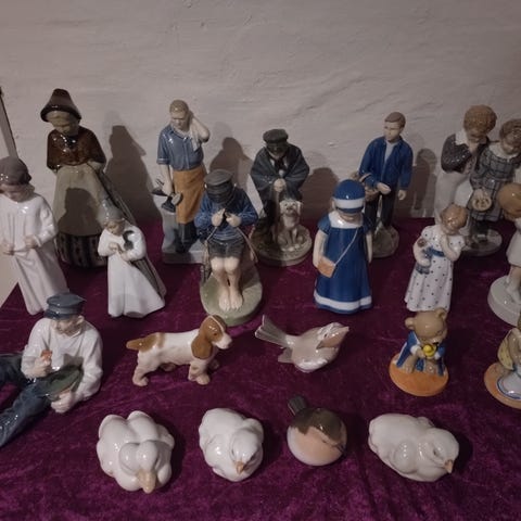Royal Copenhagen og Bing & Grøndahl porcelænsfigurer blandet lot. Samlingen omfatter flere figurer i glaseret porcelæn, herunder menneskefigurer og dyrefigurer i overvejende blå, hvide og brunlige nuancer. Figurerne har fabriksstempler og modelnumre under bunden, blandt andet Royal Copenhagen mærke med bølger og Bing & Grøndahl mærke. Velegnet til dekoration i vitrineskab eller som supplement til eksisterende samling af danske porcelænsfigurer.