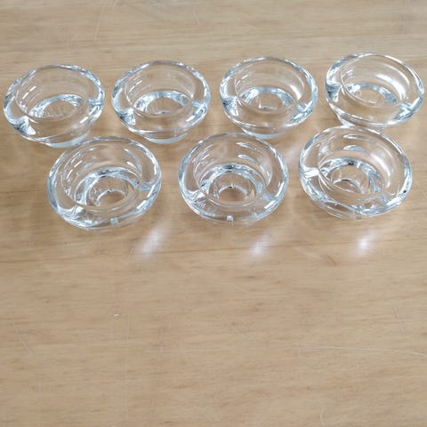 10 glas lysestager fra Reims, kan stables bund mod bund, kan bruges med fyrfadslys og alm. lys. 5 cm høje. 15 kr. pr stk. eller dem alle for 120 kr.