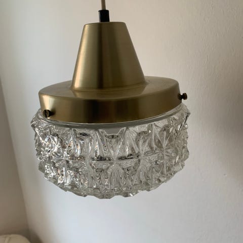 Charmerende 60'er-typisk retro loftslampe i mønstret glas messinglakeret metal og teak. I meget fin stand, uden synlige fejl. Højde 28 cm, dia: 17 cm. Alm. stor fatning. Kan hentes i Kbh/Rådhuspladsen eller i Odense M eller sendes gerne for 50 kr.. Se flere lamper - søg HNI-lamper på DBA.