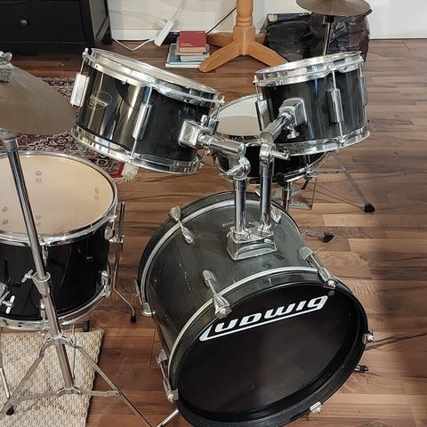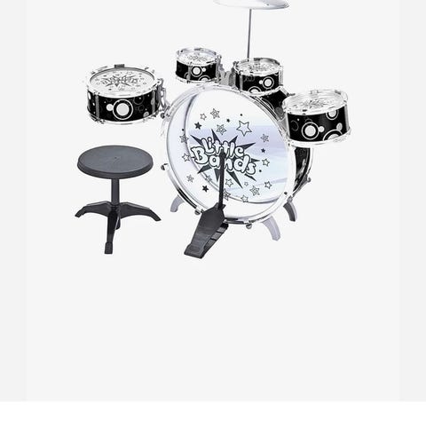 Gear4music trommesæt til børn med stortromme, lilletromme og tam. Sættet inkluderer bækken, trommestikker og højdejusterbar skammel. Trommerne har blank, flerfarvet overflade og er monteret på stativer, der er tilpasset børnestørrelse. Velegnet som begyndersæt til børn, der vil lære at spille trommer.