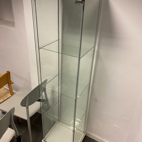 Flot lille vitrineskab i glas med ramme i messinglook. Skabet har glas på alle sider og en glaslåge med lille lukke. Der er en hylde i midten, så det er perfekt til opbevaring eller udstilling af fx smykker, parfumer, samleobjekter eller små dekorationer.