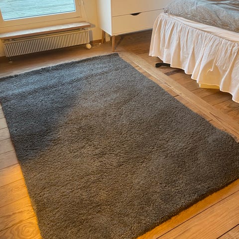 IKEA tæppe i ensfarvet grå. Rektangulær model, velegnet til stue eller opholdsrum. Blødt, tæt luv, som giver en behagelig overflade at gå på. Passer godt under sofabord eller ved siddegruppe. Materiale er typisk syntetisk fiber, som er let at støvsuge og vedligeholde.
