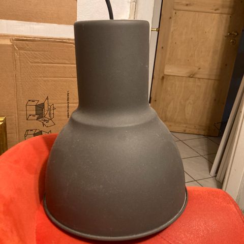 Fin loftslampe med grå tekstil skærm og sort ledning.