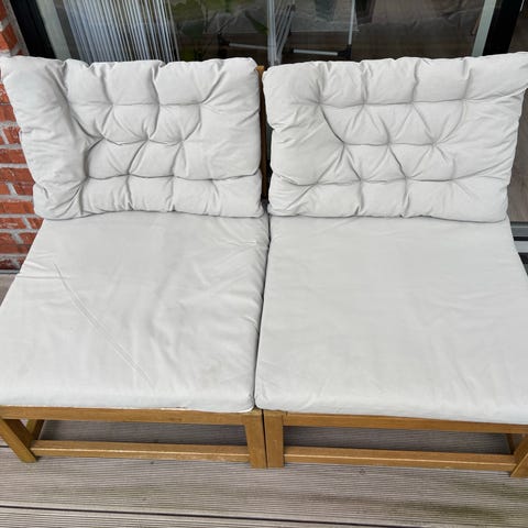 Sælger dette IKEA altan sæt med parasol samlet, perfekt til mindre altaner. Stolenes overflade trænger til pleje og puderne skal måske vaskes, men bordet og parasol med fod er i god stand.