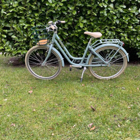 Børnecykel med 24" hjul i gul farve. Cyklen har fastmonteret frontkurv med træbund, bagagebærer med fjederklemmer, støtteben, skærme og baglygte. Egnet til større børn, der passer en 24" cykel. Designet som klassisk bycykel med lav indstigning, som gør det nemmere at komme af og på cyklen.