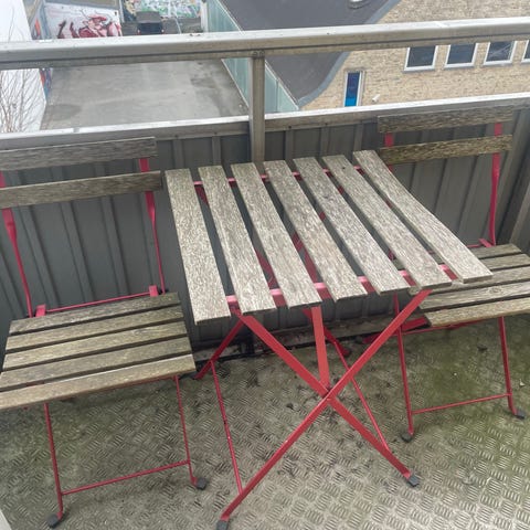 Havebord og klapstole café-sæt i sort metal. Sættet består af et firkantet bord og to matchende klapstole. Stel og plader er udført i metal med ensartet sort finish. Sættet er egnet til udendørs brug på terrasse, altan eller i have og kan klappes sammen for nem opbevaring, når det ikke er i brug. Bordet måler 65x65 cm. Meget fin stand, købt i 2025.
