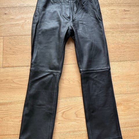 Klassisk femlommers-model med linning, bæltestropper og knaplukning foran. Bukserne har lange, lige ben og er udført i glat lædermateriale med indvendigt foer for øget komfort. Velegnet til hverdagsbrug og mere formelle anledninger, hvor der ønskes et par sorte læderbukser i damepasform. Brugt 3 gange. Tlf. 30521015