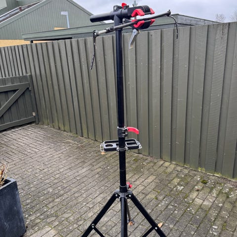 Cykel reparationsstativ i stativmodel med teleskopstang. Stativet har trebenet fod for stabilitet og er udført i sort og sølvfarvet metal med røde plastdetaljer. Højde og arbejdsposition kan justeres, så cyklen kan fastgøres i forskellige niveauer. Egnet til almindelig vedligeholdelse og reparation af cykler i hjemmet eller værkstedet.