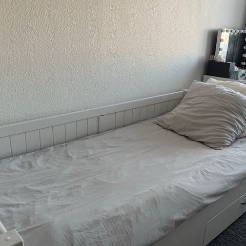 IKEA seng med opbevaring i hvid. Sengen har integrerede skuffer under liggefladen, som giver ekstra opbevaringsplads til fx sengetøj eller tekstiler. Velegnet som enkeltseng eller daybed i soveværelse, gæsteværelse eller stue. Farven fremstår som hvid, og designet er enkelt og funktionelt i træ/laminat-look, som passer ind i mange indretningsstile. Madrasserne medfølger