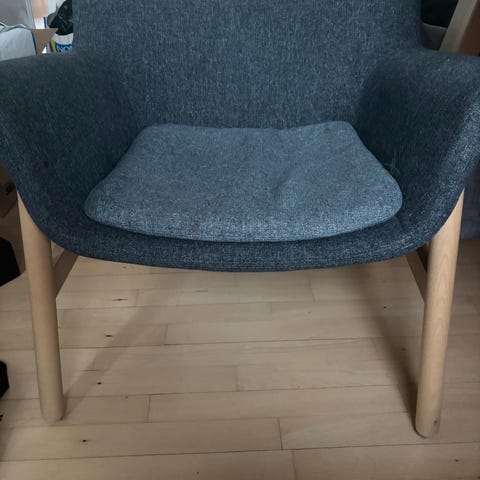 IKEA lænestol med polstret sæde og ryglæn i gråt stof. Stolen har høj ryg med integreret nakkestøtte og armlæn. Rammen er i mørkbejdset træ med buede armlæn og meder, der giver en let gyngende komfort. Velegnet som læse- eller hvilestol i stue, kontor eller soveværelse.