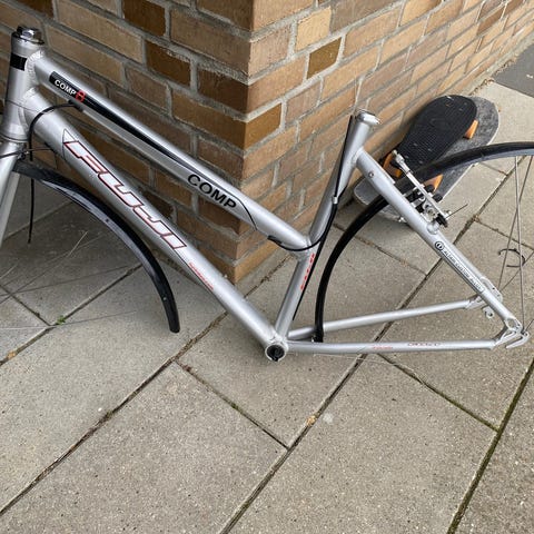 Damestel, ca. 53 cm. Ikke original forgaffel. Sadelpinden sidder godt fast, så den følger med 😊
