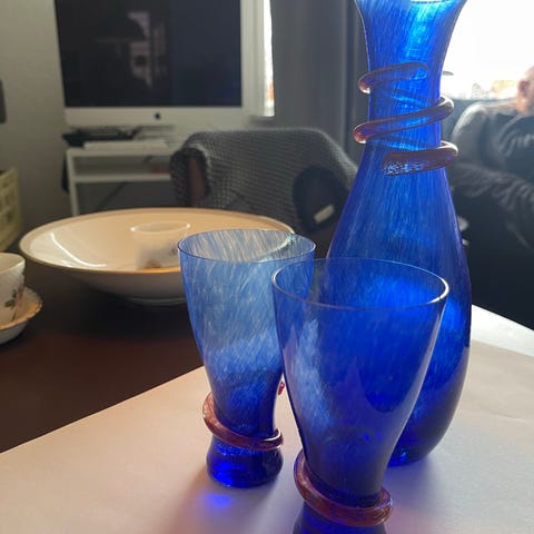 Grøn glassæt bestående af karaffel med prop og to matchende glas. Sættet er udført i gennemfarvet grønt glas med organisk, bølget form på karaflen og ensfarvede grønne glas på fod. Egnet til servering af f.eks. likør eller andre drikke ved borddækning eller som dekorativt indslag i indretningen.