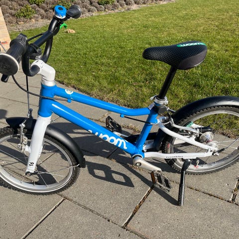 Meget velholdt Woom 3 børnecykel med 16" hjul (4-6 år). Cyklen har rød aluminiumsramme med hvid forgaffel og hvide detaljer. Udstyret med håndbremser, kædeskærm, støtteben (som er købt udover) og dæk med mønster, der egner sig til kørsel på både asfalt og fast underlag. Sadel og styr er justerbare, så cyklen kan tilpasses barnets højde.