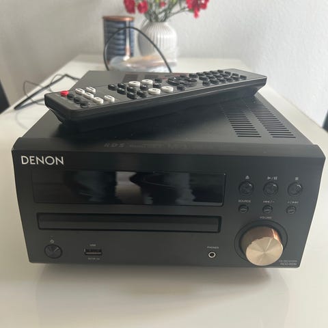Sælger mit Denon RCD‑M37 stereoanlæg. Det er en ældre model, men spiller stadig virkelig godt og er kendt for at være et solidt lille kvalitetsanlæg. Perfekt til stuen, kontoret, køkkenet eller som et godt anlæg til kolonihaven.