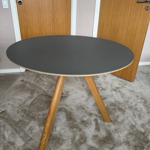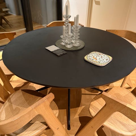 Flot spisebord med sort linoliumsplade og egetræsstel.